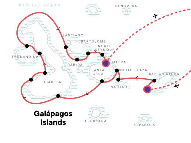 Flights to either of the airports in the Galapagos leave early in the morning on Day 2 and get you into the islands in the early afternoon. Flights back to the mainland depart between 10:00am and 1:30pm arriving in the early evening.